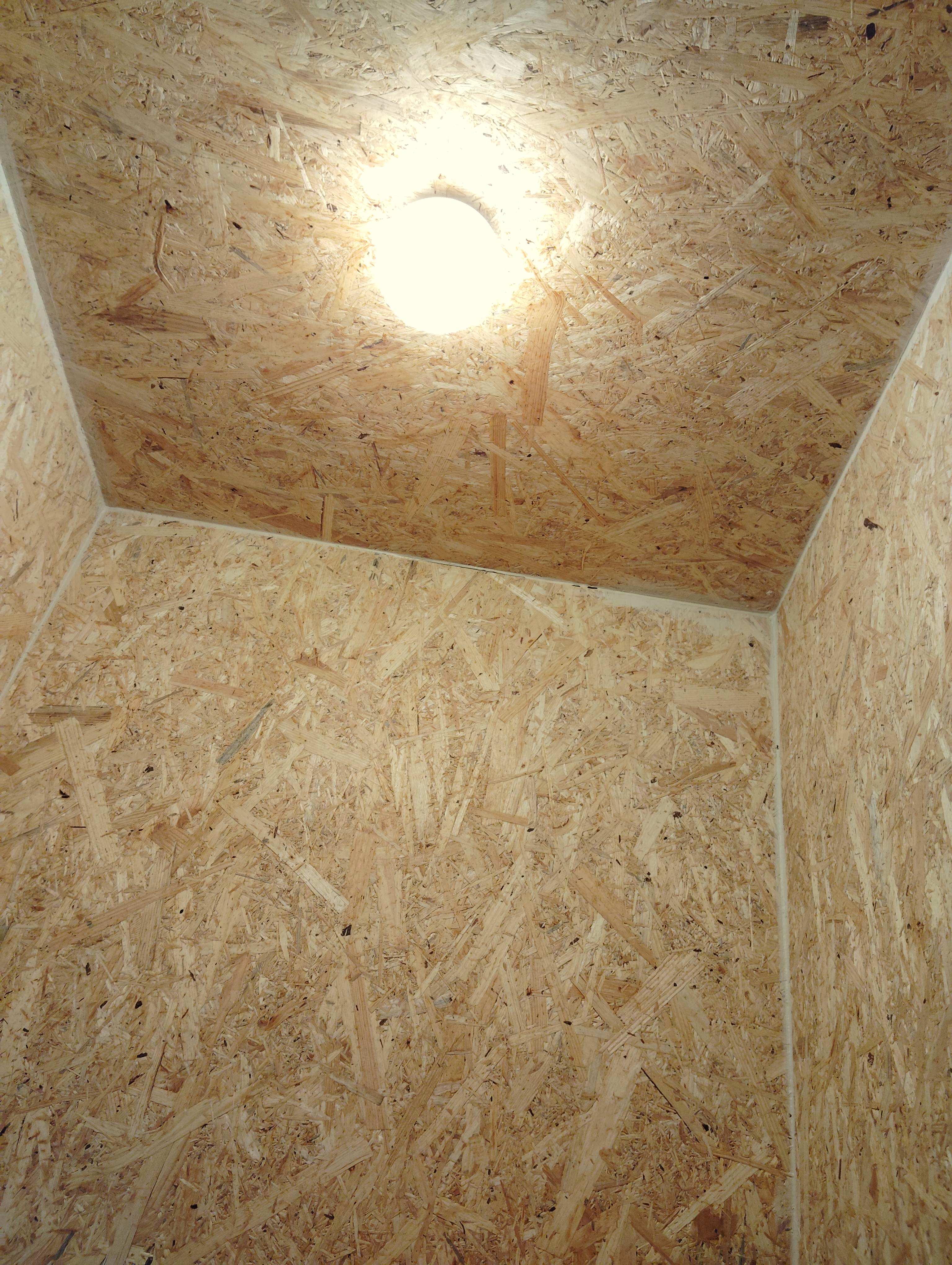 壁と天井をMDF合板で貼り直して、豆電球を100Wの照明に変えた。